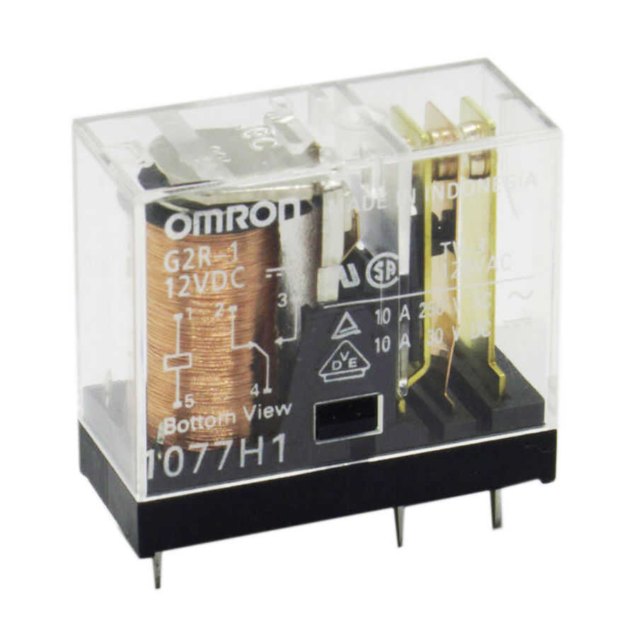 12V 10A Tek Kontak Omron Röle ( 5 PİN ) - G2R-1, elektriksel yöntemlerle kontrol edilebilen mekanik anahtarlama ünitesidir. Röle bobini ve kontaktörler olmak üzere iki ana bölümden oluşur. Üzerinden akım geçen röle bobini manyetik alan oluşturur ve kontakları çeker. Böylece röle kontakları konum değiştirmiş olur. Telekom uygulamalarında, gaz dedektör devrelerinde, RF kontrol uygulamalarında, Infrared kontrol uygulamalarında, küçük hacimli devrelerde(ciklet röle) vb çalışmalarda tercih edilen devre elemanlarındandır. 5V, 9V, 12V, 24V, 48V, 220V çalışma gerilimlerinde, 1A-40A arası yük akımlarının kontrolünde kullanılır. Tekli ve çoklu kontak çıkış imkanları mevcuttur.